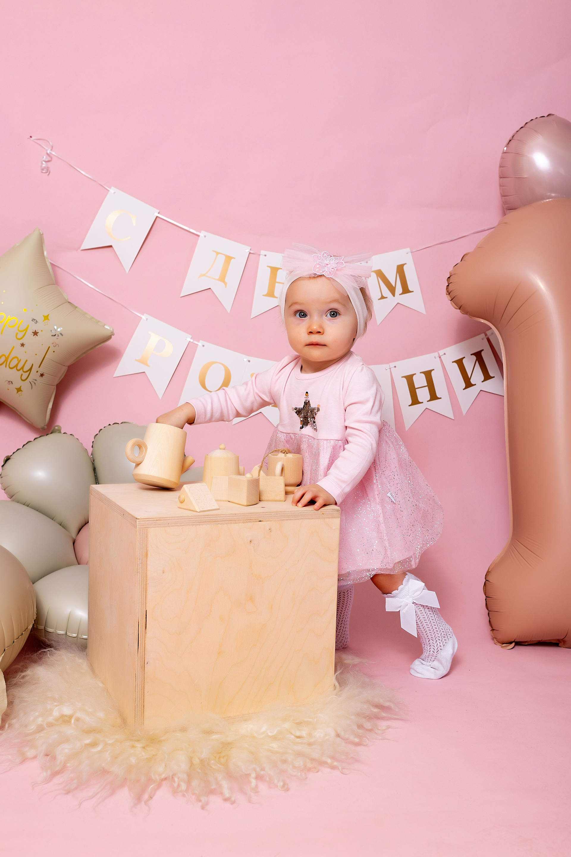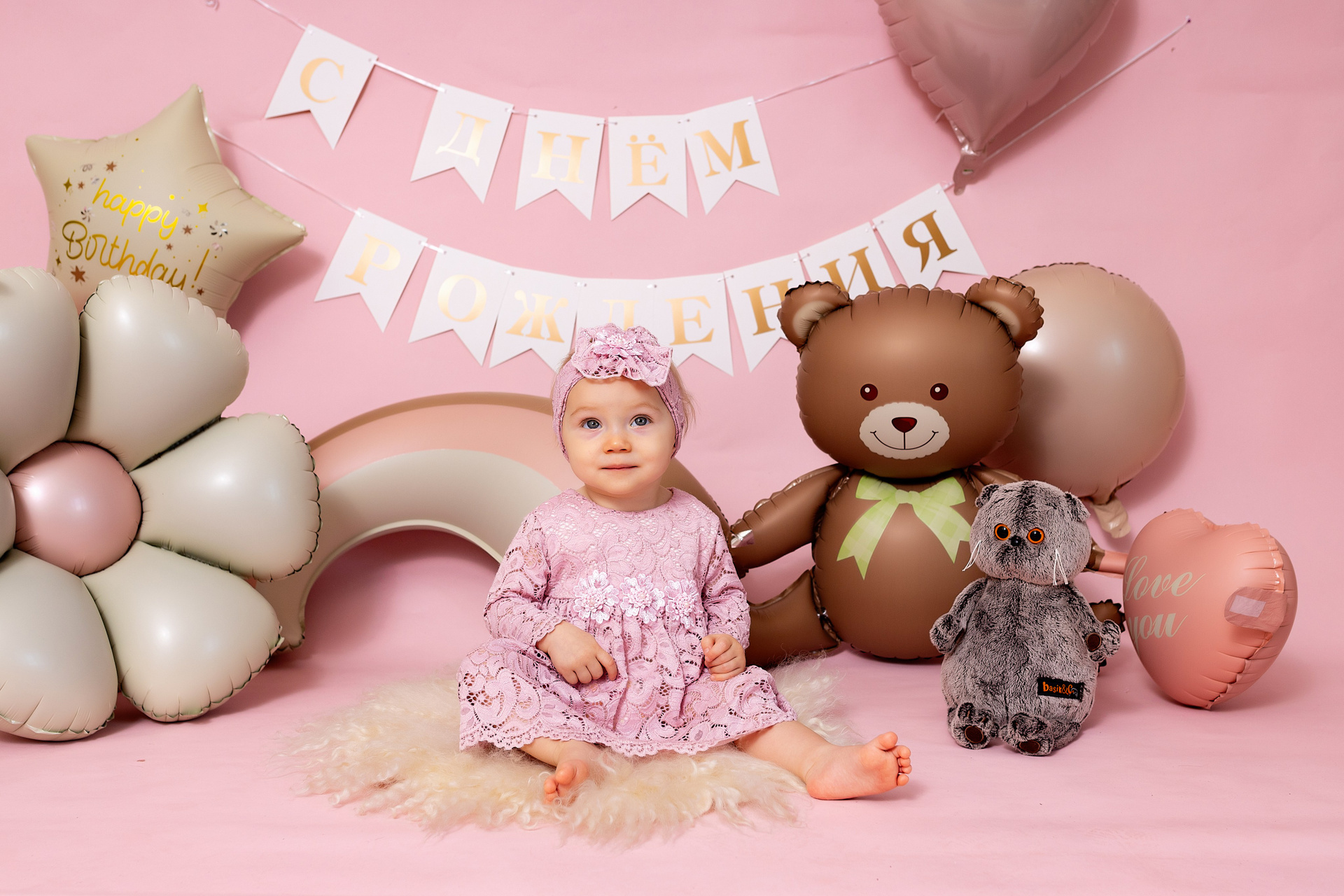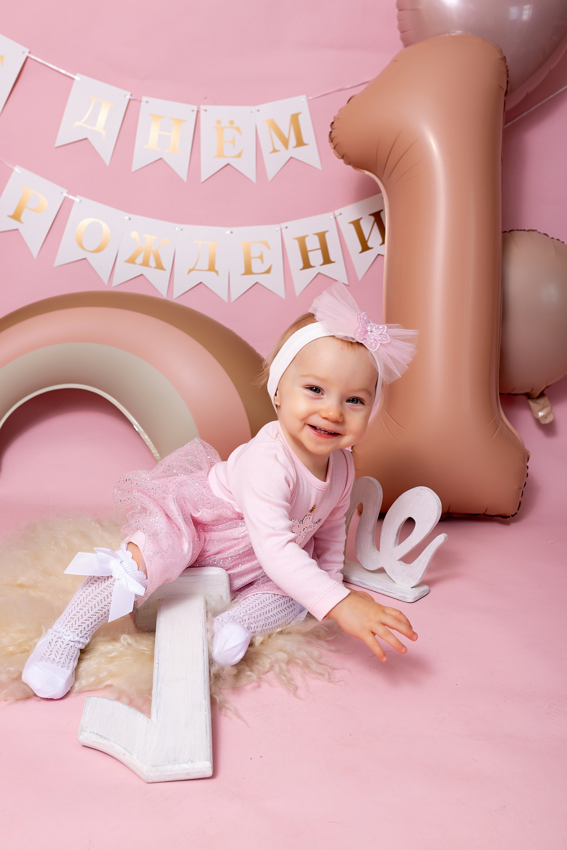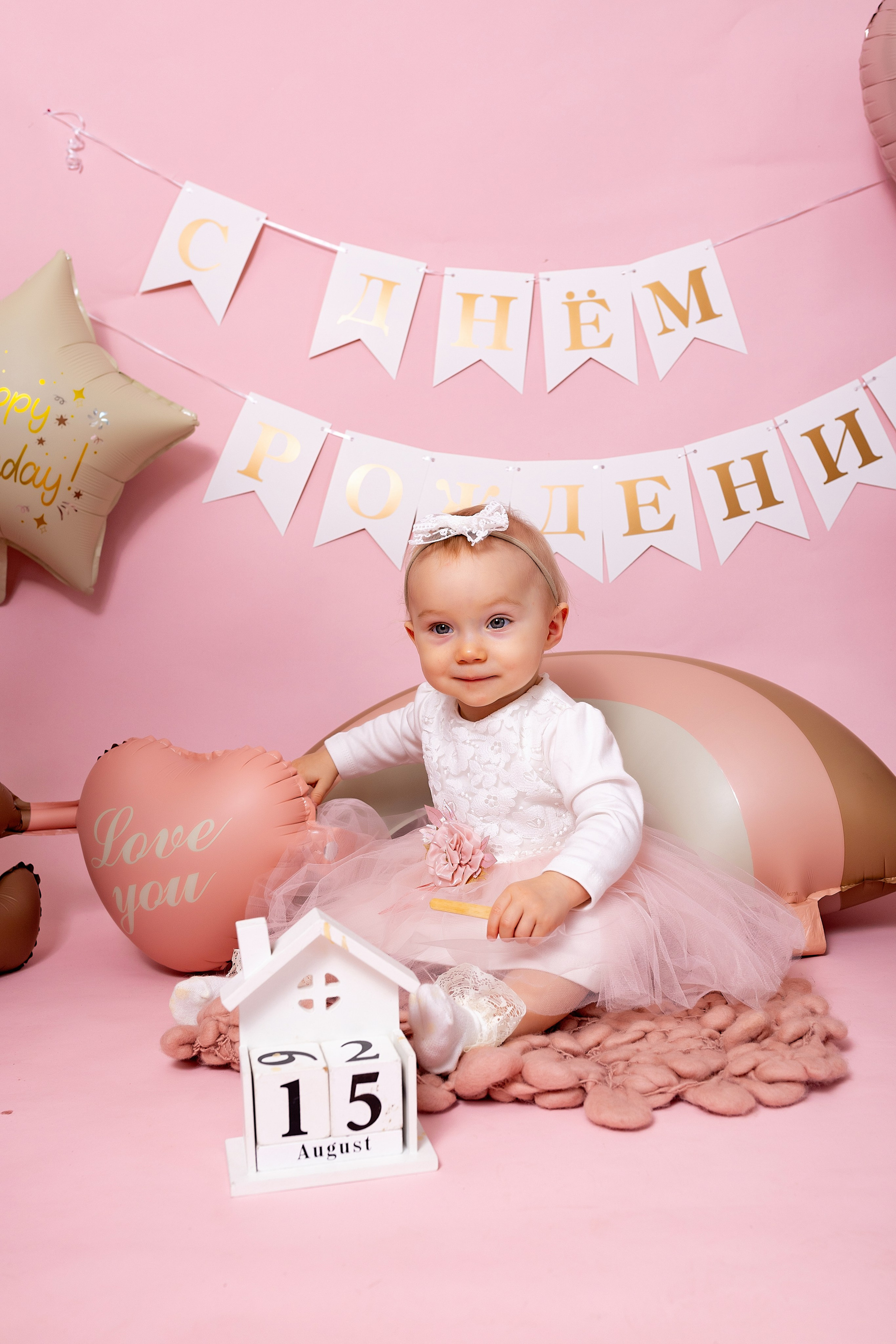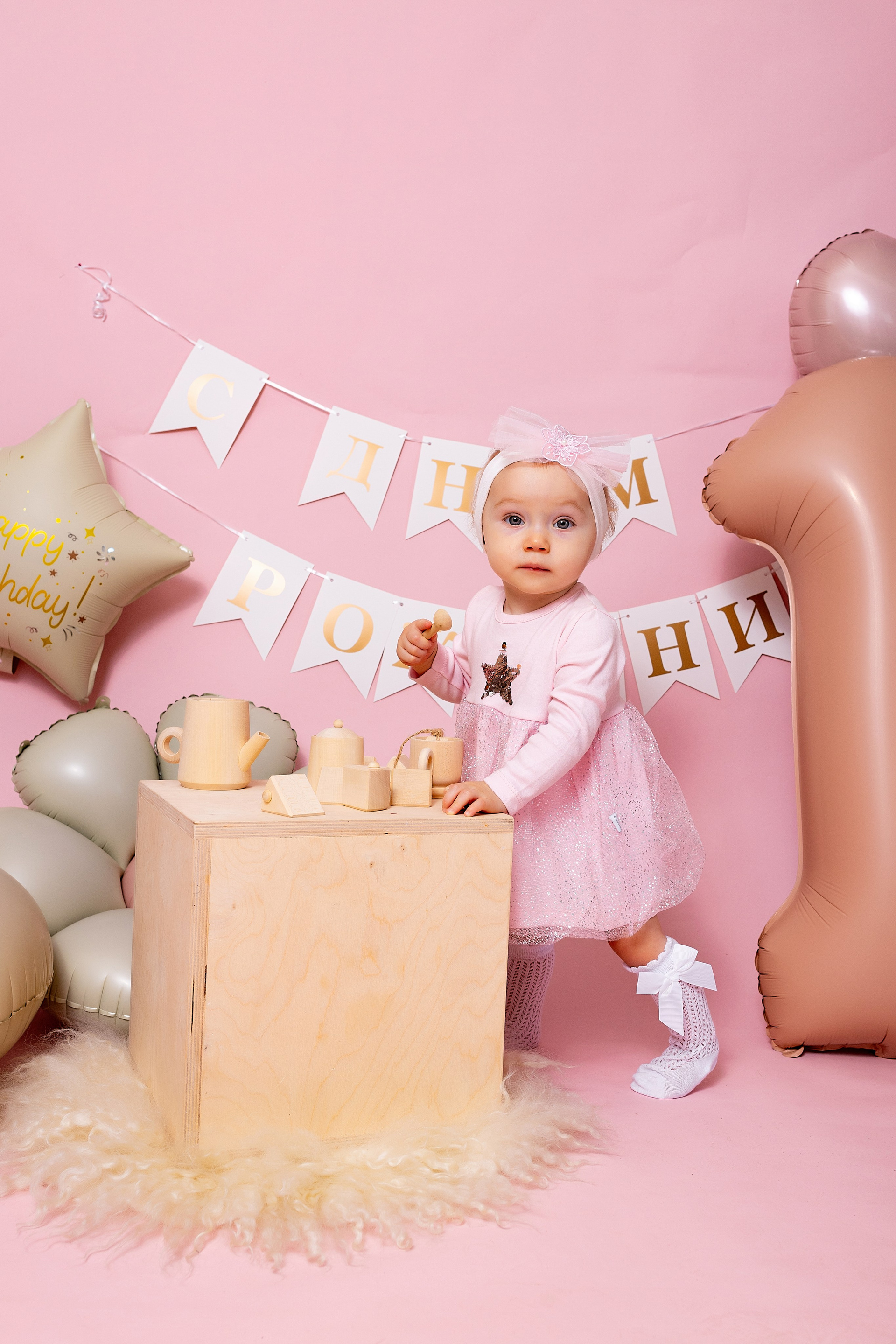 У меня в фотостудии в Железнодорожном есть проект «Праздник под ключ». Он идеально подходит для съемки годовасия! Мои партнёры заранее привозят в студию декор и торт, в выбранной цветовой гамме. А после съемки их можно забрать домой. Когда вы приходите на фотосессию дня рождения, студия превращается в праздник, в калейдоскоп счастливых мгновений. Видео с праздничной съемки я делаю для вас в подарок!