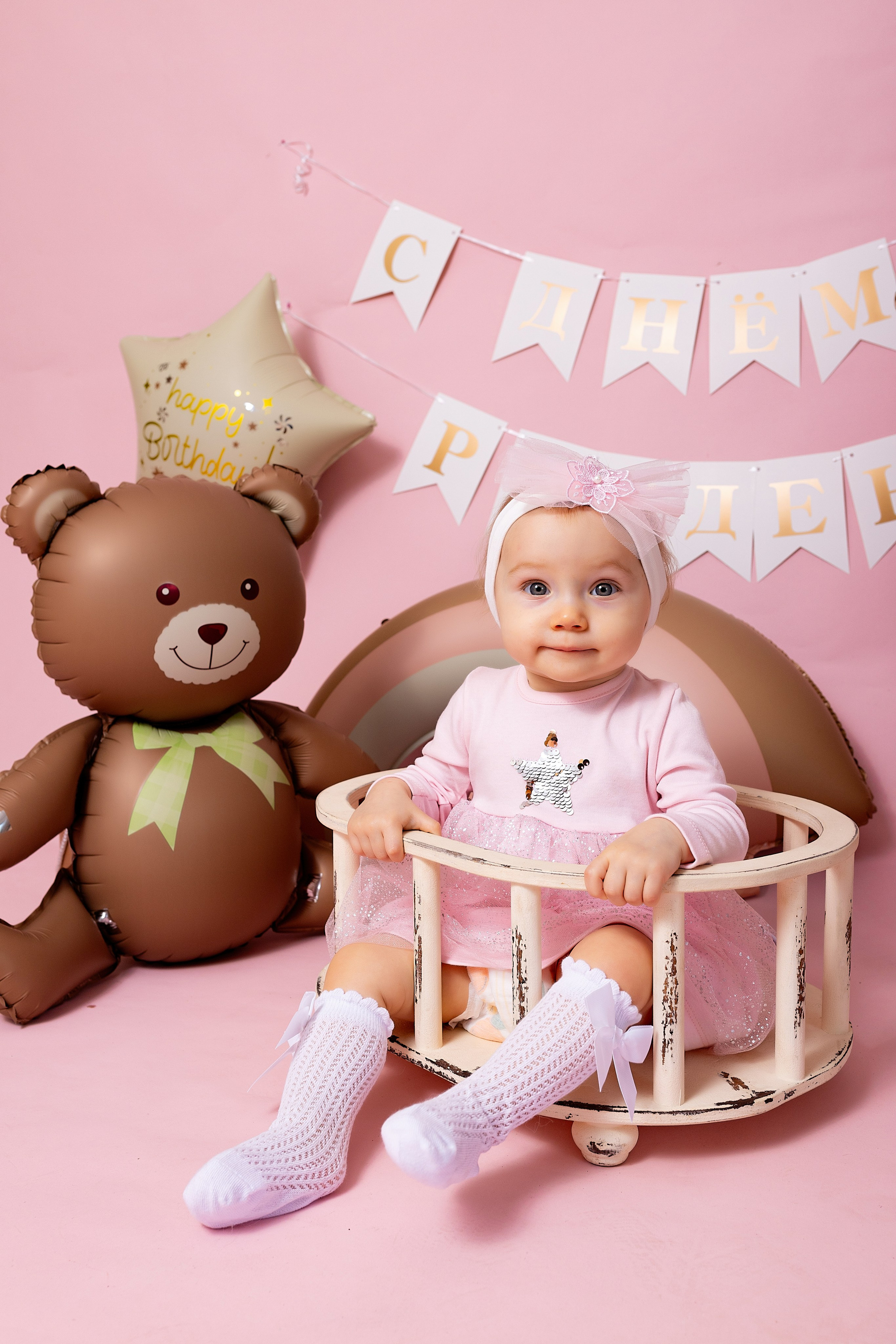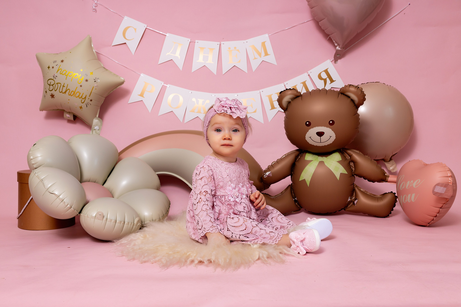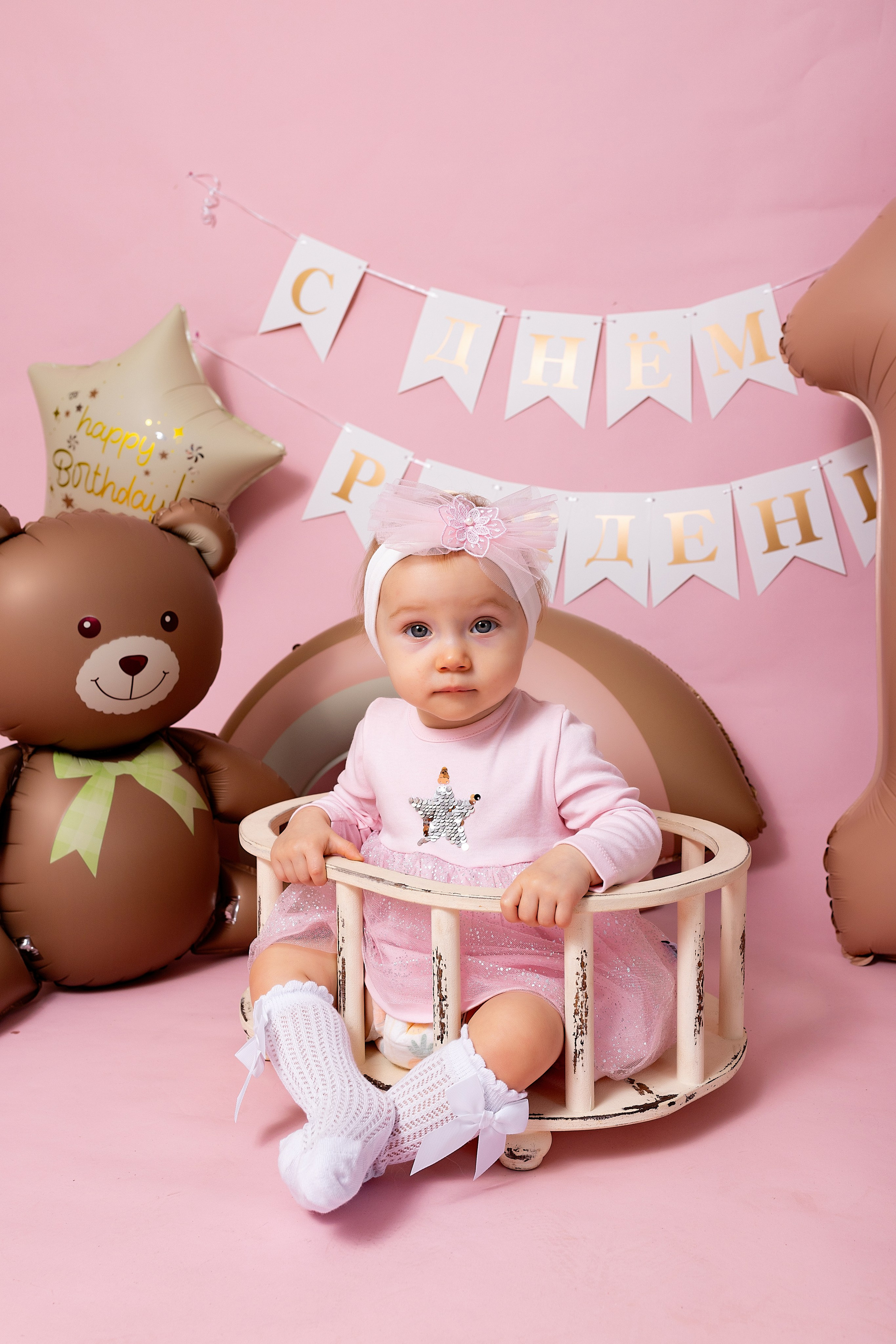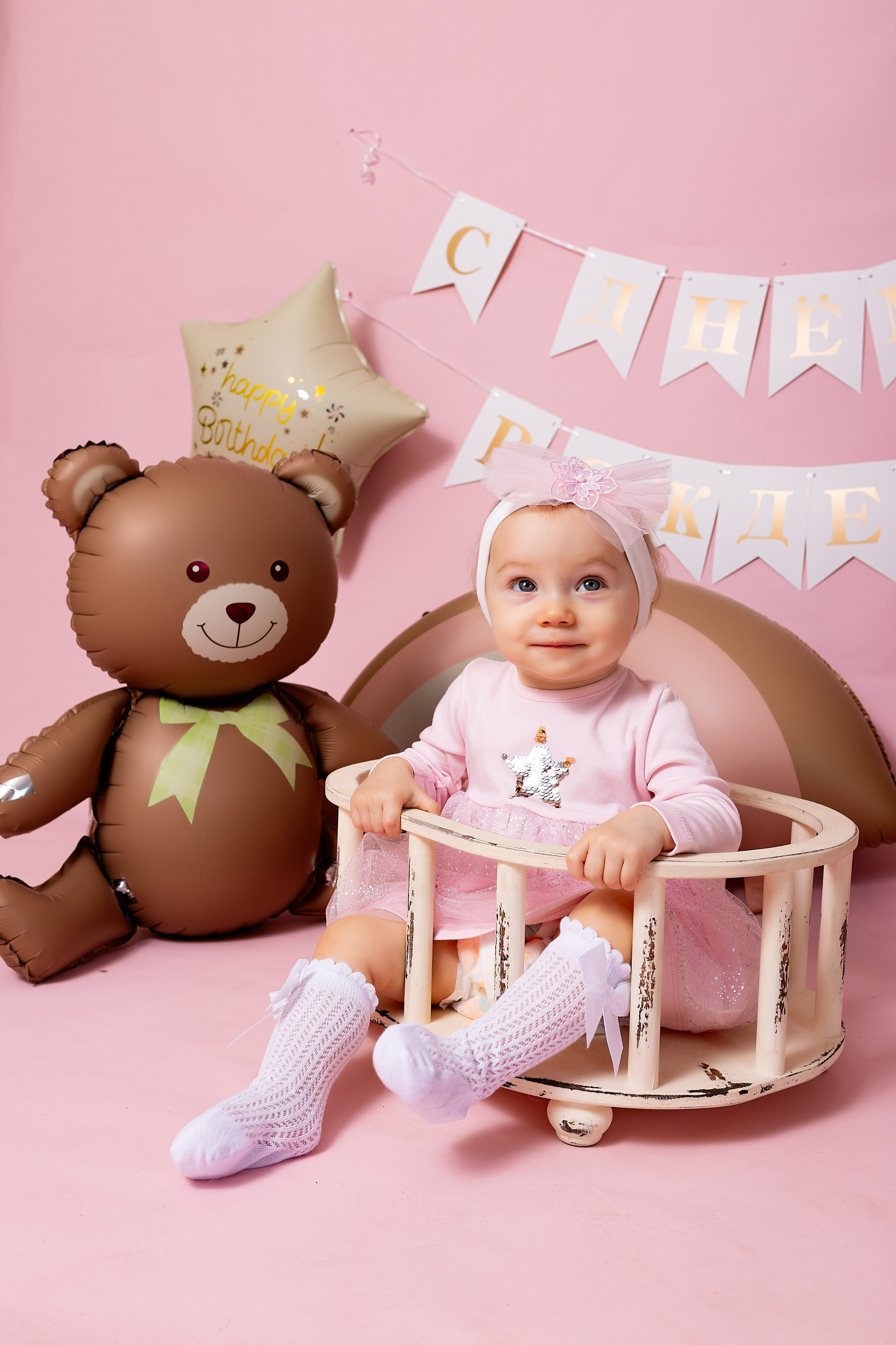 У меня в фотостудии в Железнодорожном есть проект «Праздник под ключ». Он идеально подходит для съемки годовасия! Мои партнёры заранее привозят в студию декор и торт, в выбранной цветовой гамме. А после съемки их можно забрать домой. Когда вы приходите на фотосессию дня рождения, студия превращается в праздник, в калейдоскоп счастливых мгновений. Видео с праздничной съемки я делаю для вас в подарок!