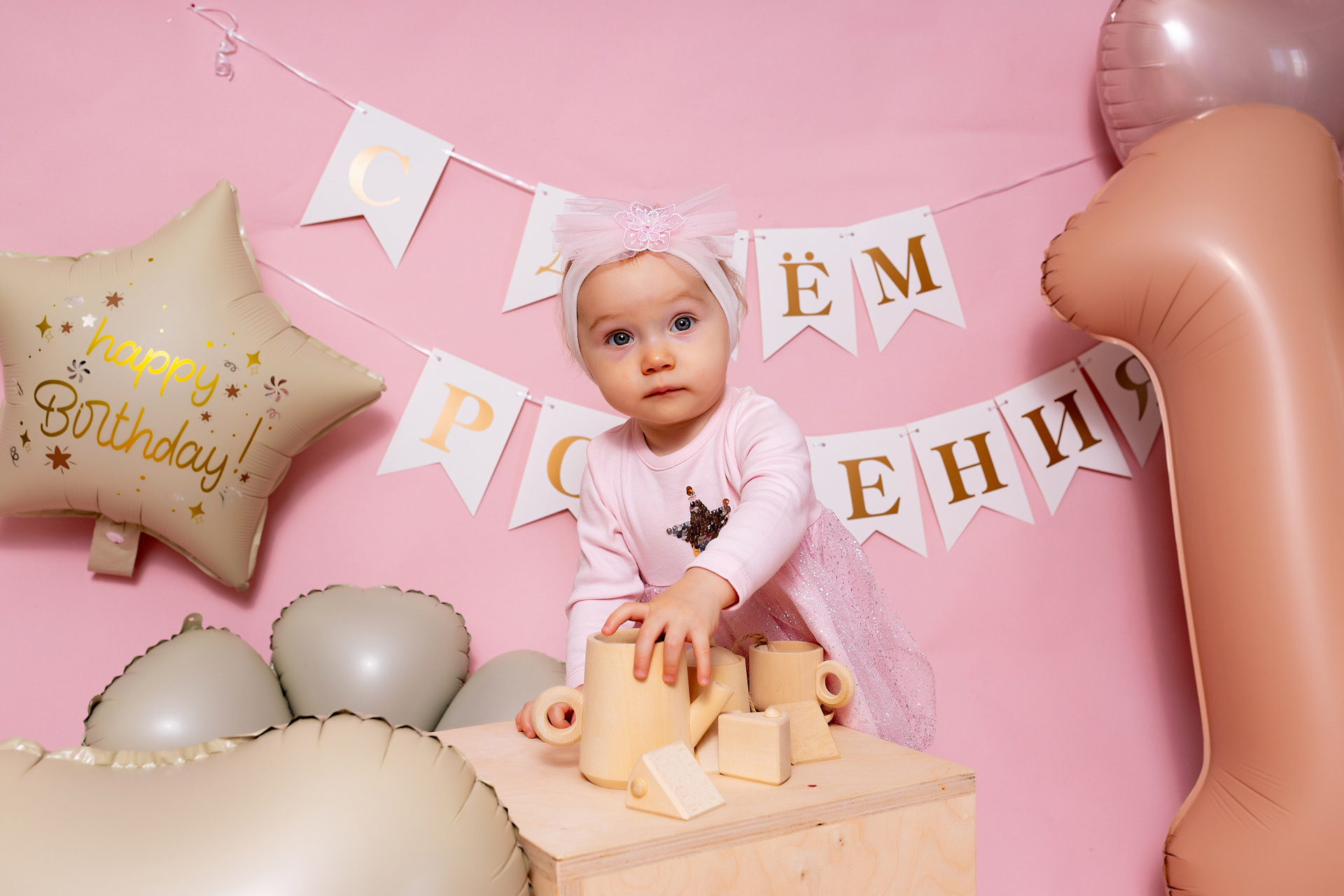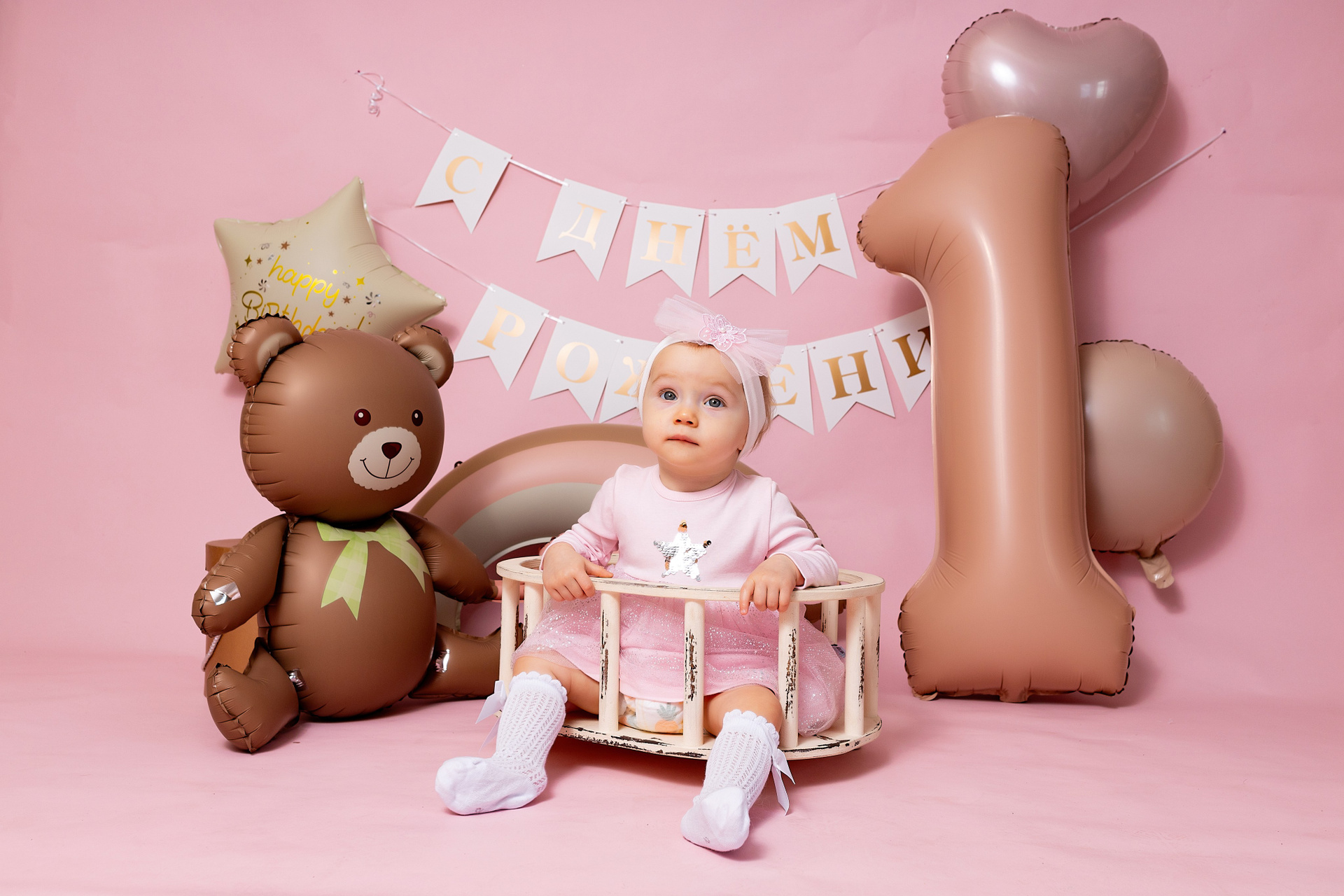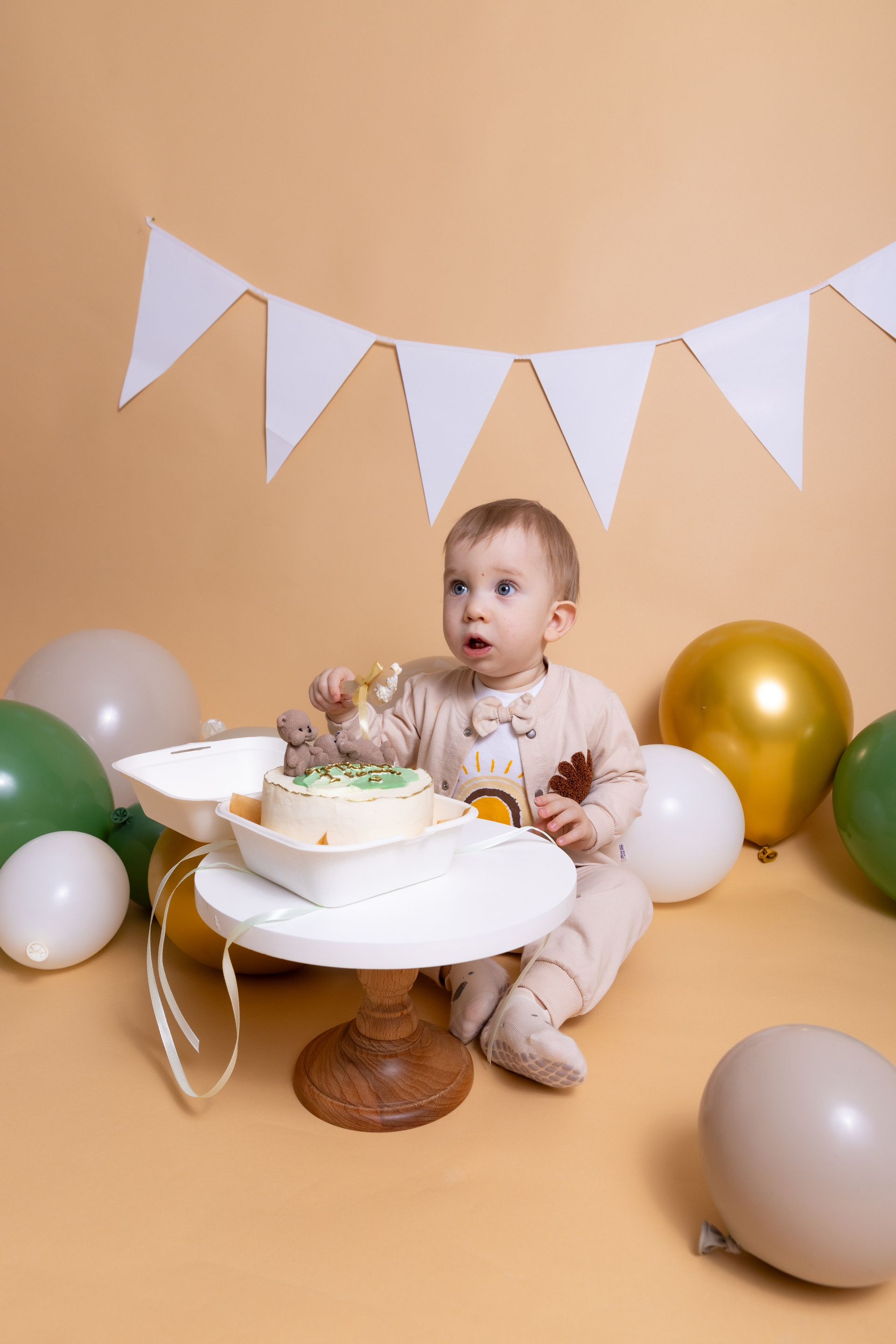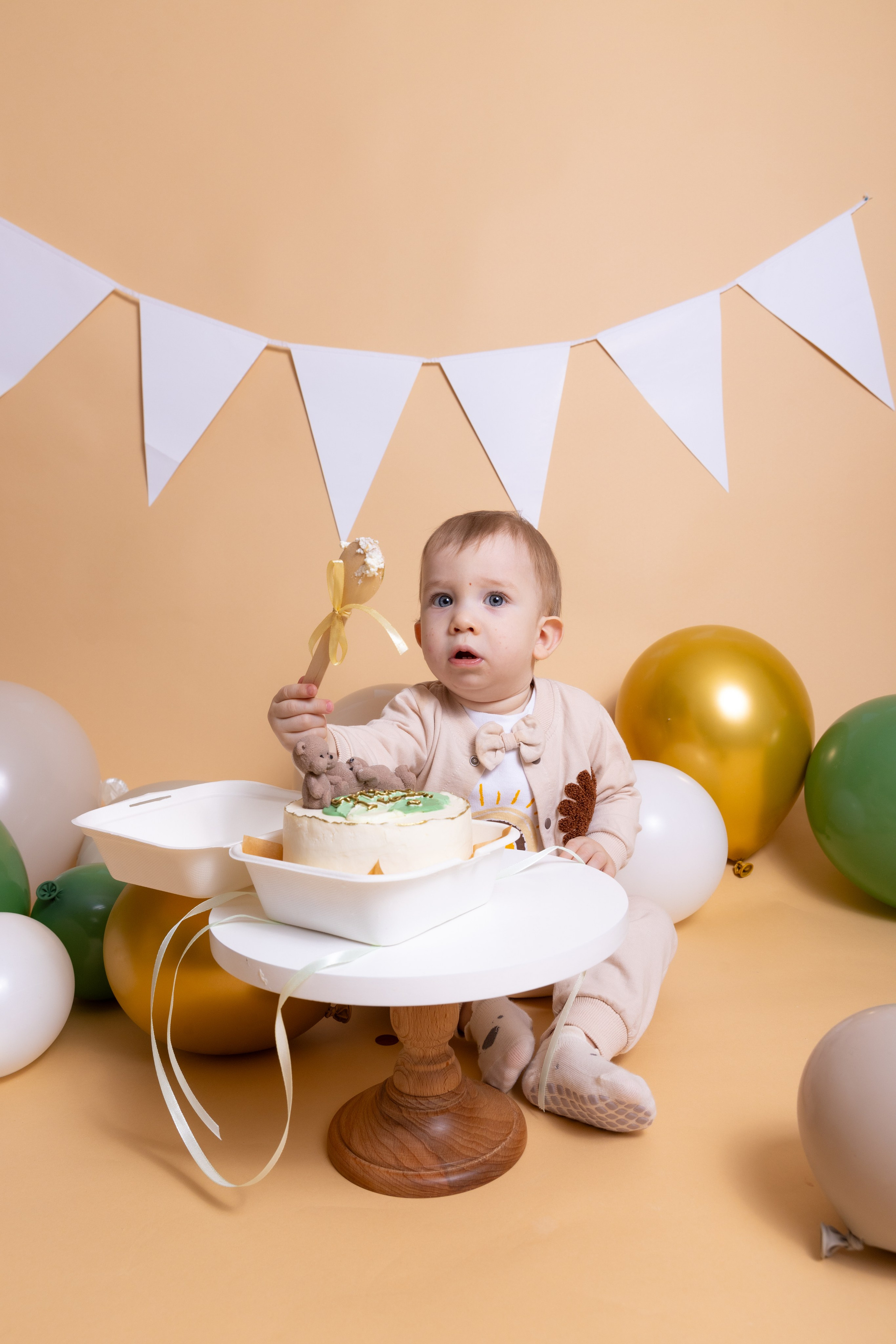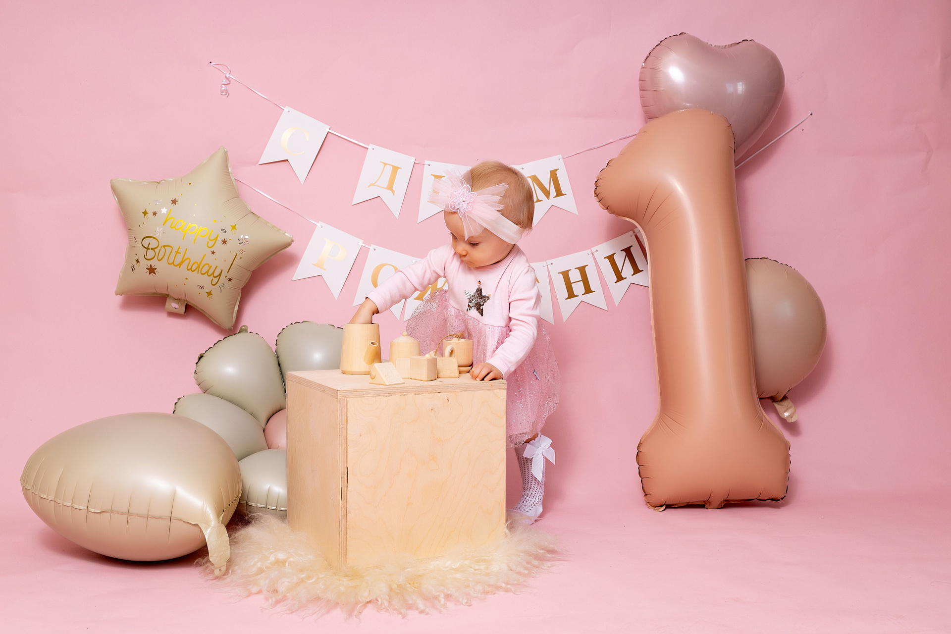 У меня в фотостудии в Железнодорожном есть проект «Праздник под ключ». Он идеально подходит для съемки годовасия! Мои партнёры заранее привозят в студию декор и торт, в выбранной цветовой гамме. А после съемки их можно забрать домой. Когда вы приходите на фотосессию дня рождения, студия превращается в праздник, в калейдоскоп счастливых мгновений. Видео с праздничной съемки я делаю для вас в подарок!